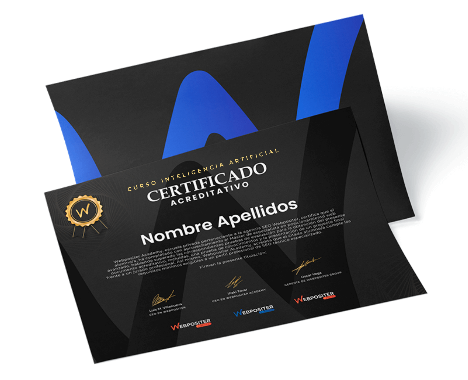 Titulación de Inteligencia Artificial avalada por Webpositer Academy y firmada por Nicolás Cort que podrás obtener una vez visualices el Curso y superes la autoevaluación final.